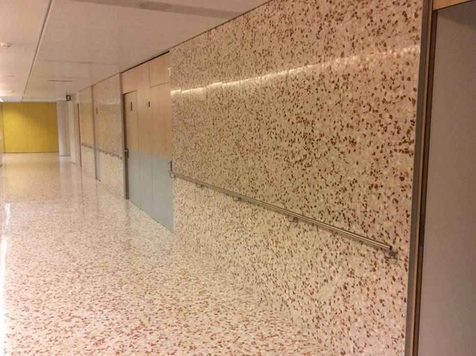 Revestimiento de terrazo bicapa o monocapa con acabado superficial pulido, granallado, envejecido o abujardado de fábrica, listo para colocar en paramentos verticales u horizontales.